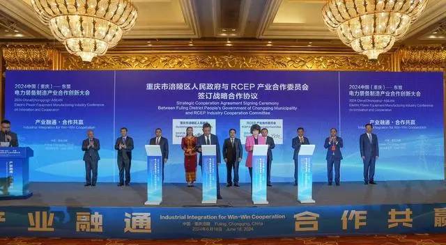 On June 18, 2024, Advisor, Luckchai Industrial Estate attended The “2024 ASEAN-China Electric Power Equipment Manufacturing Industry Conference on Innovation and Cooperation Innovation” held in Fuling District, Chongqing, Sichuan Province, with representatives from 11 countries, RCEP members, entrepreneurs and experts. More than 200 people from related industries of China joined the conference to discuss cooperation between China and ASEAN in the electric power equipment manufacturing industry. On this occasion, an MOU was signed between Kebao Cable Co., Ltd., a top-10 cable manufacturer in China, and Luckchai Industrial Estate as well. 2024年6月18日,立盛工业园区的顾问出席在四川省重庆市涪陵区举办的“2024中国(重庆)—东盟电力装备制造产业合作创新大会”,来自11个国家、RCEP成员、企业家代表以及和专家。来自中国相关行业的200余人参加会议,共商中国与东盟电力装备制造业合作。 值此之际,中国电缆十大制造商科宝电缆股份有限公司与立盛工业园区签署了谅解备忘录。